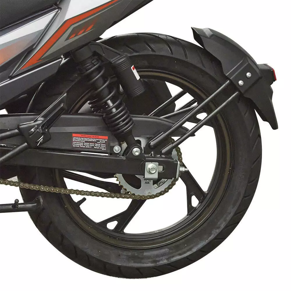 Рама - Дуплексна, трубчастий каркас Диск переднього/заднього колеса - Легкосплавний литий 5-спицевий Розмір шин: передня/задня - 90/90-17 / 120/80-17 Підвіска переднього колеса - Телескопічна вилка Підвіска заднього колеса - Маятникова з двома амортизаторами Амортизатори передні - Масляні Амортизатори задні - Пружинно-газомасляні Тип переднього гальма - Дисковий гідравлічний Тип заднього гальма - Барабанний механічний Гальмівна рідина - DOT 3, DOT 4 Габаритні розміри (ДхШхВ), мм - 2010х790х1100
